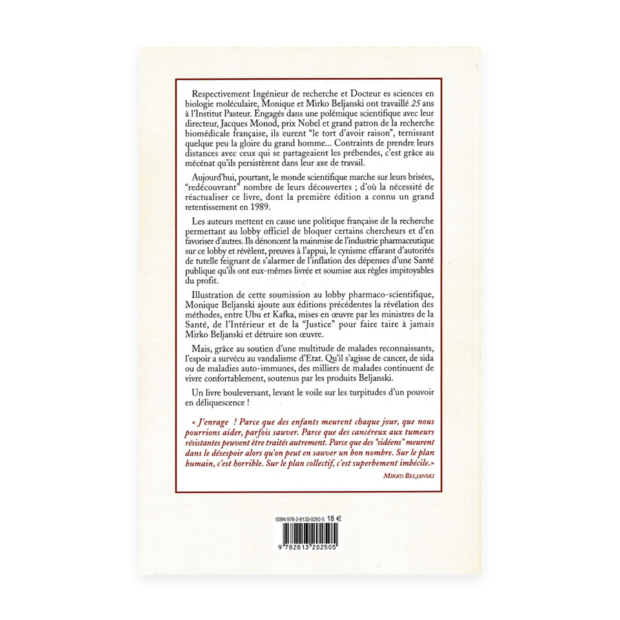 Ce premier livre présente les principes d'action et toute la réflexion scientifique ayant permis d'aboutir aux "produits Beljanski". A sa publication, le biologiste sera invité sur de nombreux plateaux de télévision et interviewé par de nombreux médias, mais l'appareil judiciaire, soumis à l'ordre établi et à de gros enjeux financiers, ne laissera aucune chance au chercheur indépendant.