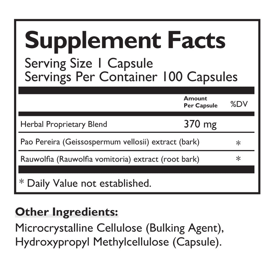 Each capsule contains 310 mg of Pao Pereira extract and 60 mg of Rauwolfia extract.