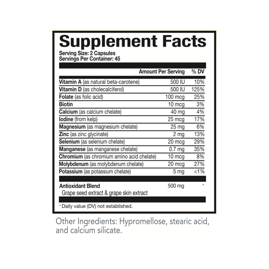 Vitamin-Mineral Antioxidant is an "all in one" formula, guaranteeing a daily supply of major antioxidants to fight against oxidative stress, digestive enzymes to get the most from the nutrients in our diet, and chelated minerals for optimal absorption of those nutrients.*